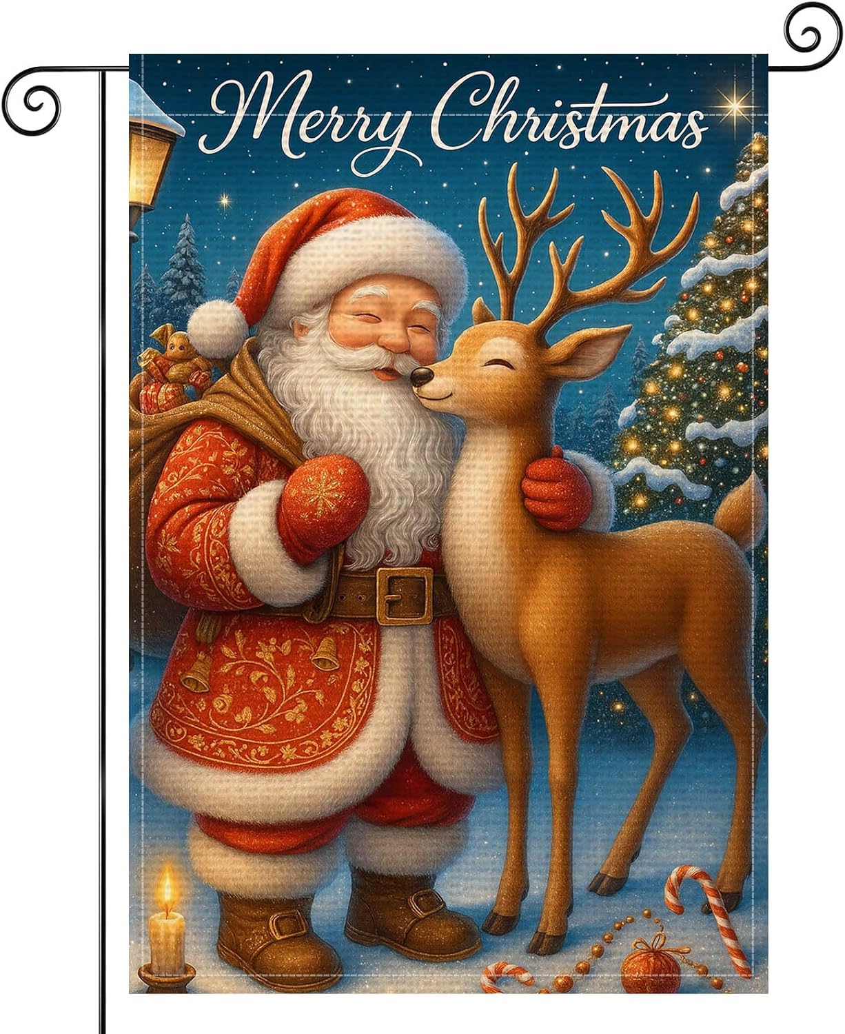 - Heartwarming Santa Scene: This Christmas garden flag features Santa Claus embracing a gentle reindeer under a starry winter sky, adding warmth to your seasonal garden flags.