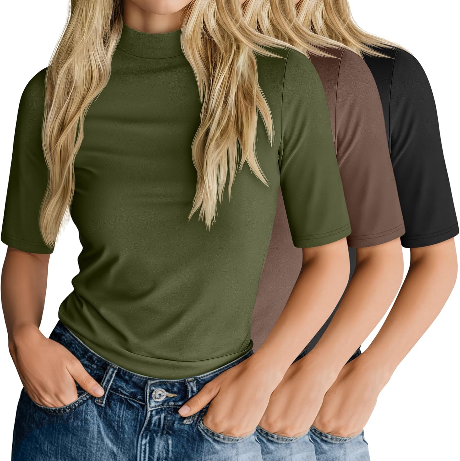 Ficerd 3 Pack Women's Mock Turtleneck T-Shirts 1/2 Half Sleeve Dressy Casual Tunic Tops Slim Fit Summer Basic Tee Shirts 2026