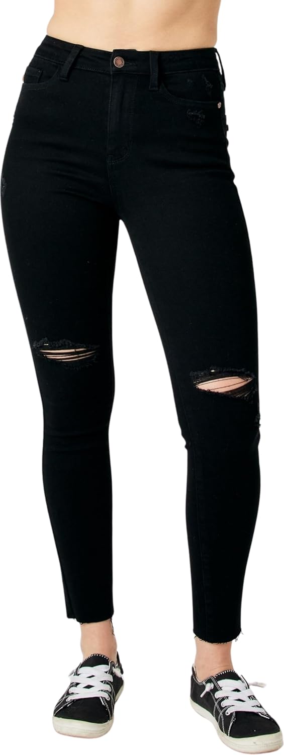 Judy Blue Women's High-Rise Heavy Destroy Raw Hem Skinny Jeans 88562 (Black, 16 Plus)