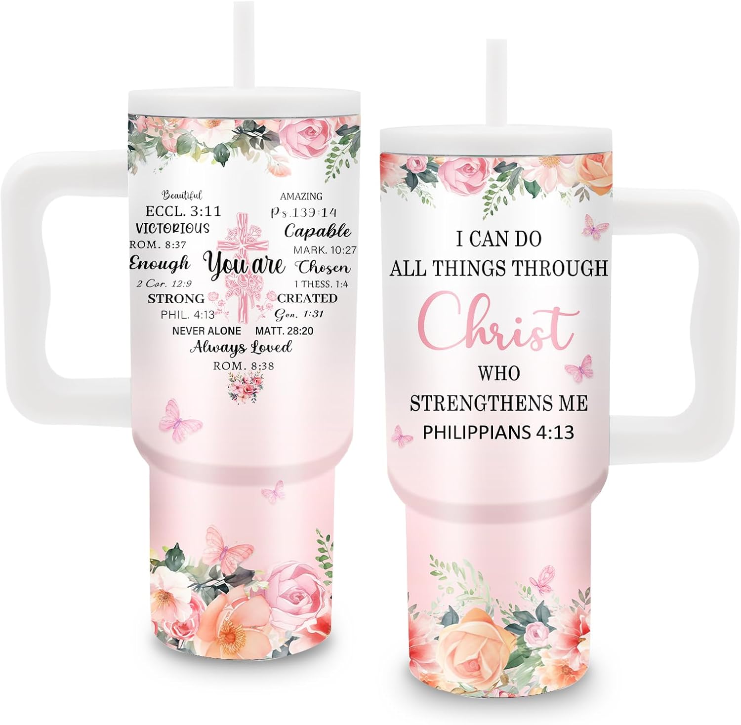 Christian Gifts for Women - 24 oz Christ Tumbler with Handle and Straw, Insulated Stainless Steel Cup, Leakproof, Spiritual Religion Biblical Church Travel Mug, Fits Car Cup Holders, Keeps Drinks Cold