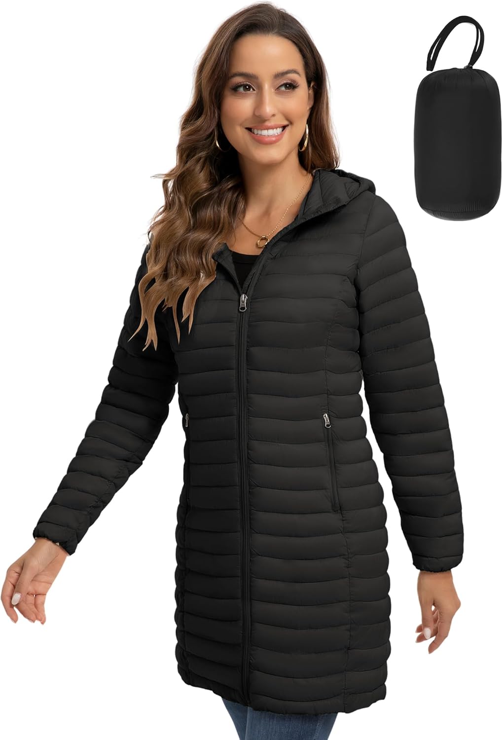 ROYAL MATRIX Packable Puffer Jacket for Women Lightweight Hooded Quilted Long Travel Puffer Coat