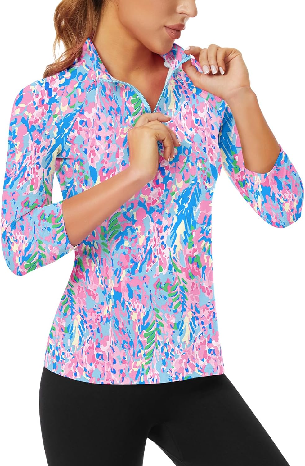 WOWENY Women's 3/4 Sleeve Athletic Golf Shirts Quarter Zip Pullover Collared T-Shirt Workout Print Tennis Top
