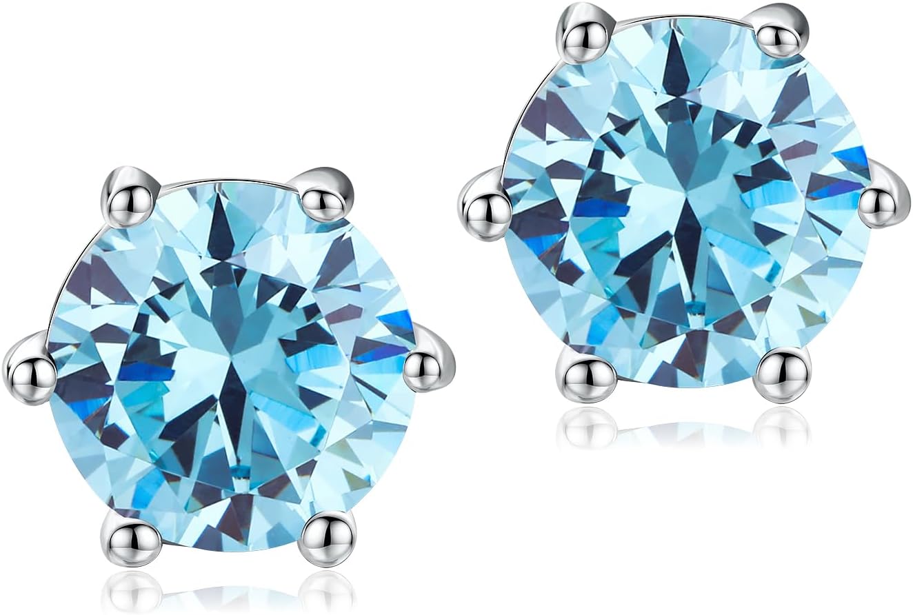 DAYBYDAY 925 Sterling Silver Birthstone Earrings for Women, Crystal Stud Earrings, 6.5mm Round Cut Solitaire Gemstone Earrings Birthday Jewelry