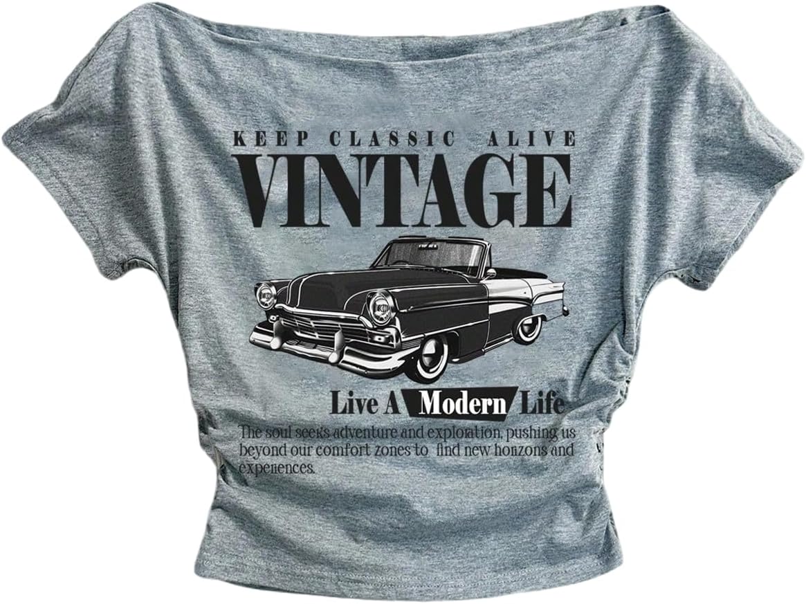Women's Off The Shoulder Y2K Letter Graphic Tops Short Sleeve Tees Fitted Retro Vintage Summer T Shirts