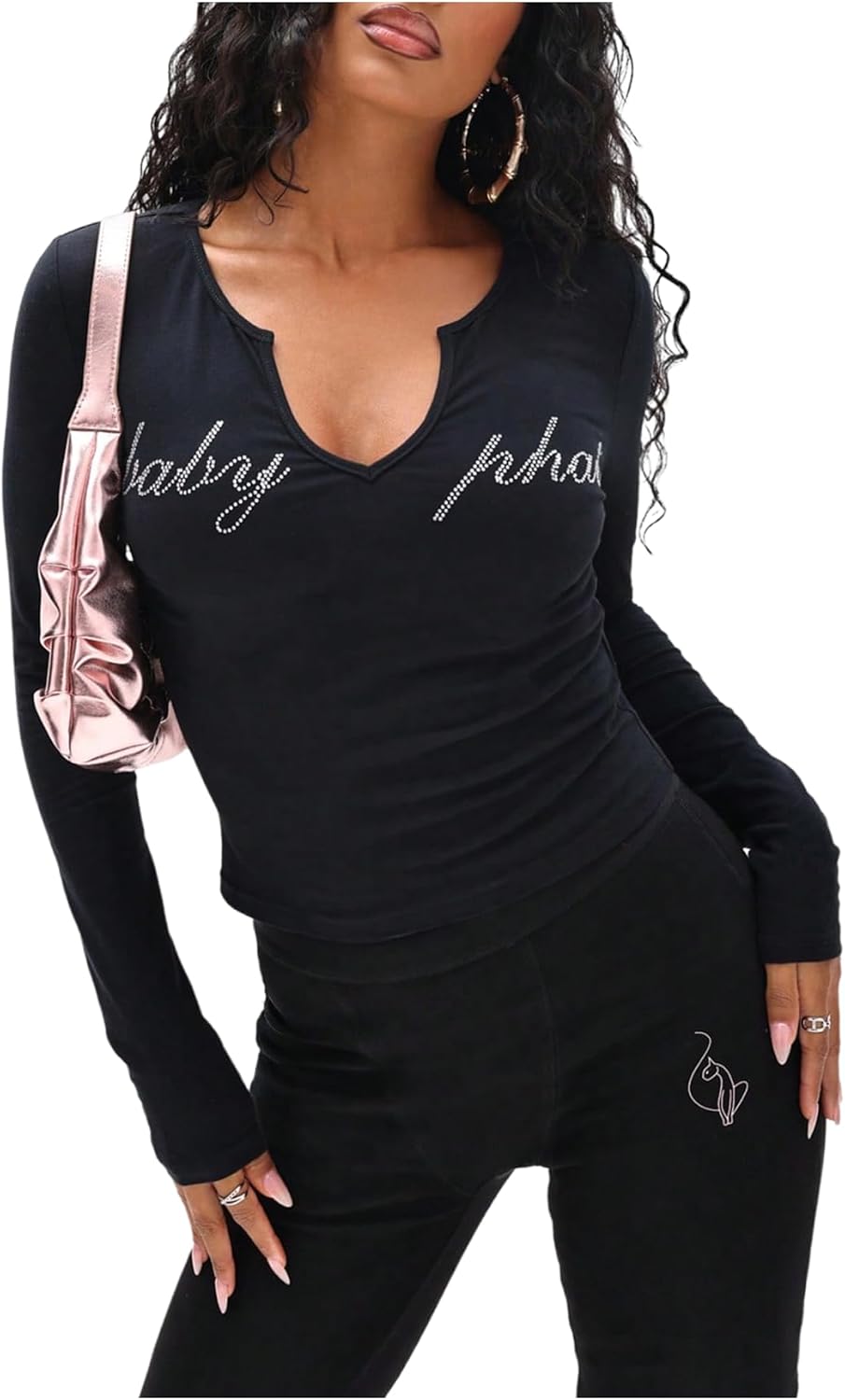 SOLY HUX Women's Long Sleeve Shirts Rhinestone Letter Graphic Tees Notched V Neck Fitted Tops