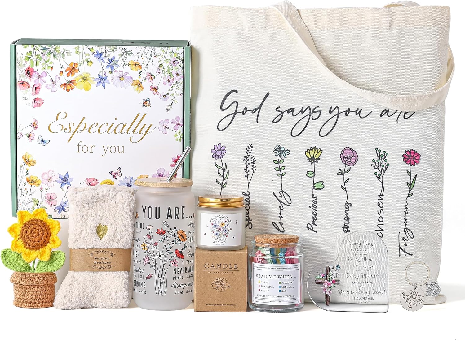 - Religious Gifts for Women: This christian gifts set includes 9 inspiring items:a gifts box, christian bag, glass cup, Bible verse jar, candle, keychain, socks, crochet sunflower and heart-shaped acrylic ornament.Each designed for daily use while carrying messages of faith. Ideal as baptism gifts for girl, religious gifts for women, inspirational gifts for women, birthday, christmas gifts, thanksgiving, every piece serves as a reminder of god’s love and the timeless truths of the bible, bringing encouragement and strength to her everyday life