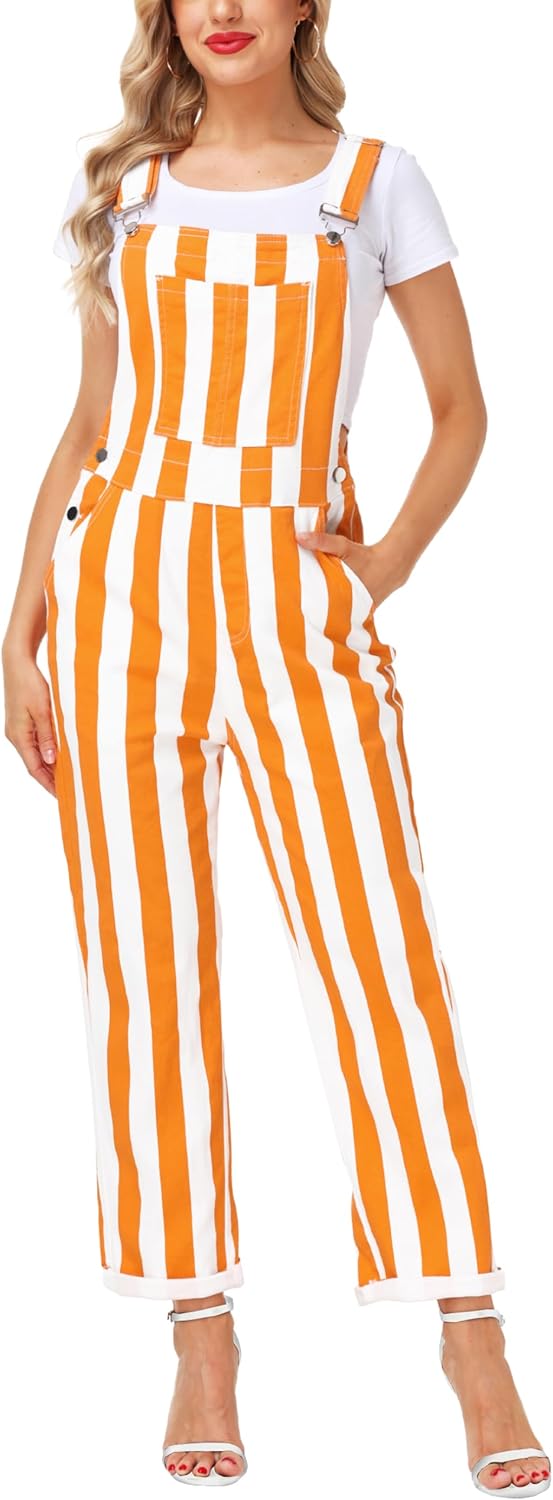 Womens Striped Bibs Overalls Cotton Denim Coveralls Stretch Jeans Jumpsuit