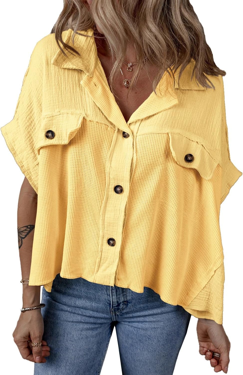 Women's Collared Button Down Shirts Casual Cap Sleeve Waffle Blouses Tops