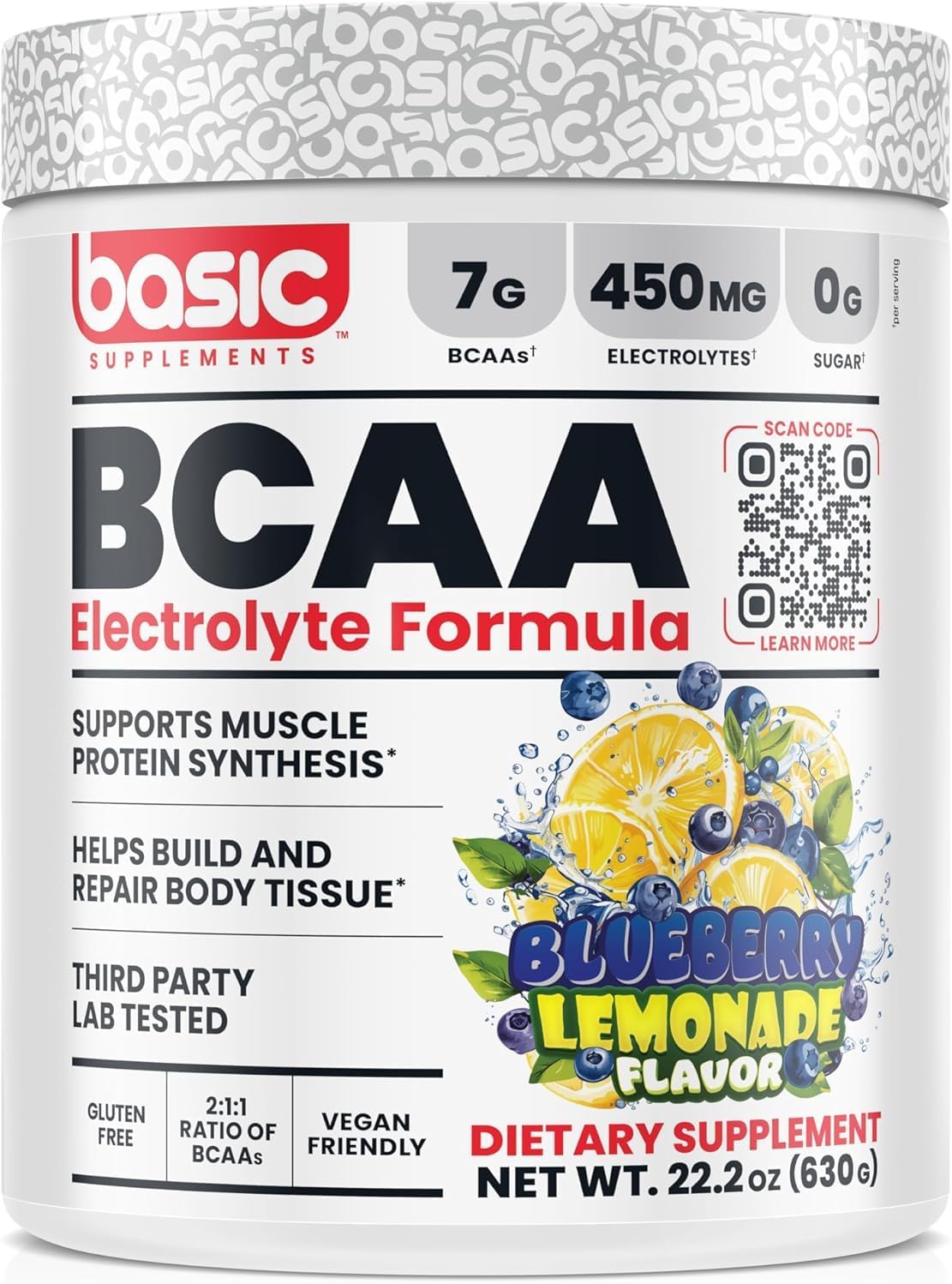 BCAA Powder, Instantized Formula with 7g BCAAs, 2:1:1 Ratio, 450mg of Electrolytes, Sugar-Free, Vegan, Gluten-Free, Supports Muscle Recovery