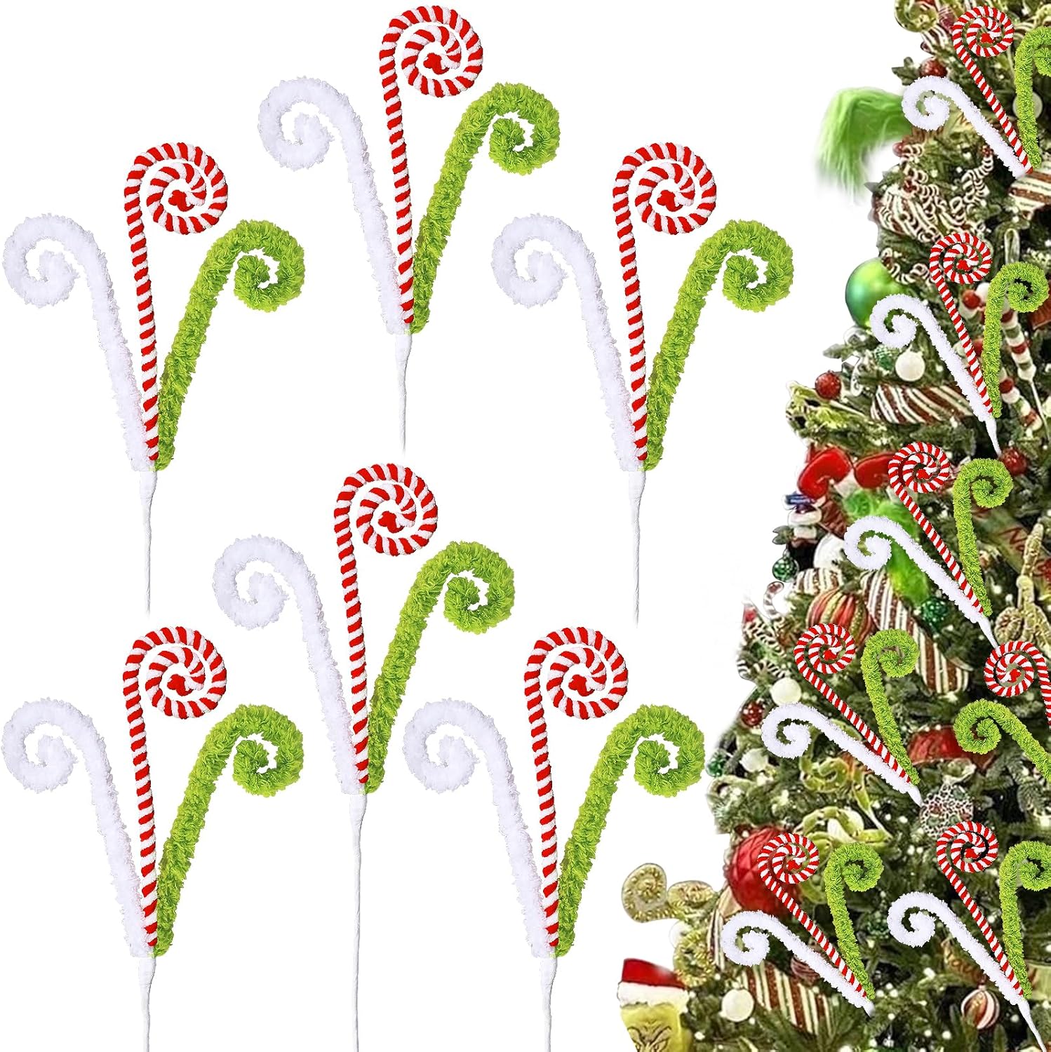RINOLY 6 Pcs Christmas Tree Topper,16 in Red Green White Candy Cane Christmas Tree Decorations,Woolen Curly Christmas Tree Picks Ornaments for Holiday Decorations Vase Filler Garland (Green)