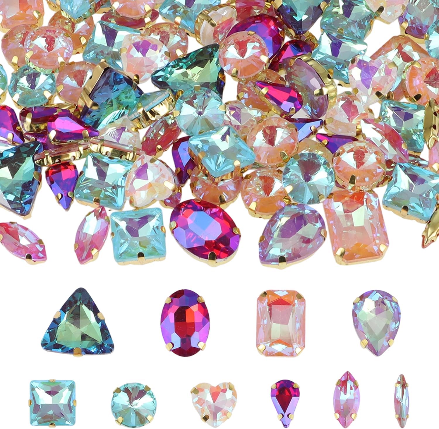 50PCS Sew on Rhinestones Mixed Color Mixed Shapes Glass Rhinestones Sew on Crystal Gems Mental Flatback with Gold Claw for Crafts Clothes DIY Jewelry Making