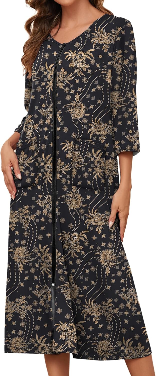 Bloggerlove Zipper Front Robes for Women House Coat Half Sleeve Loungewear Long Nightgown with Pockets S-3XL