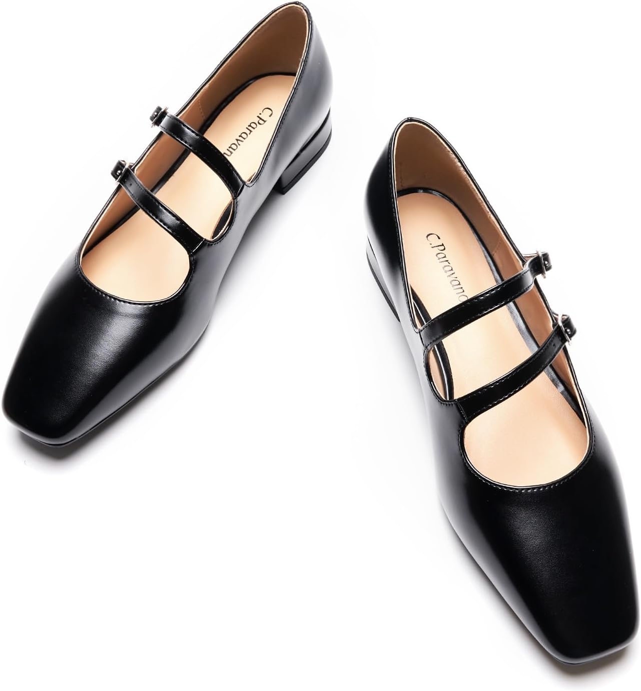 C.Paravano Women's Mary Jane Shoes | Ballet Flats | Women's Flats | Square Toe | Flat Shoe | Block Heel