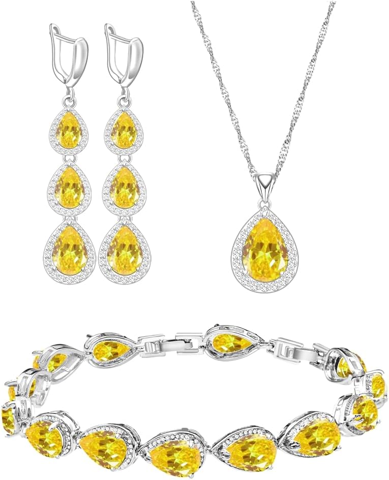 LMXXVJ Necklace Long Earrings Bracelet Set, White Gold Plated Created Blue Sapphire Jewelry Set Wedding Party Gift Jewelry for Women Bridal Bridesmaid