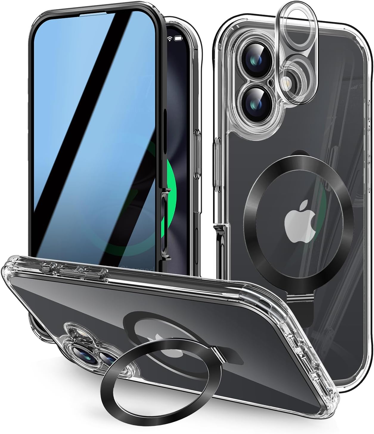 - 【Invisible Magnetic Stand & Hinge Design Never Fall】Unlike other stand case, our iPhone 16 case stand makes the ring to snap tightly into the transparent back, never lift up or fall off. The built-in closure hinge design makes the stand completely invisible when folded. It has passed over 10000 opeing/closing tests to ensure it will not deform after multiple uses. Fold back to return to the original position. The 40°~120° adjustment angle can help you choose the best viewing angle.
