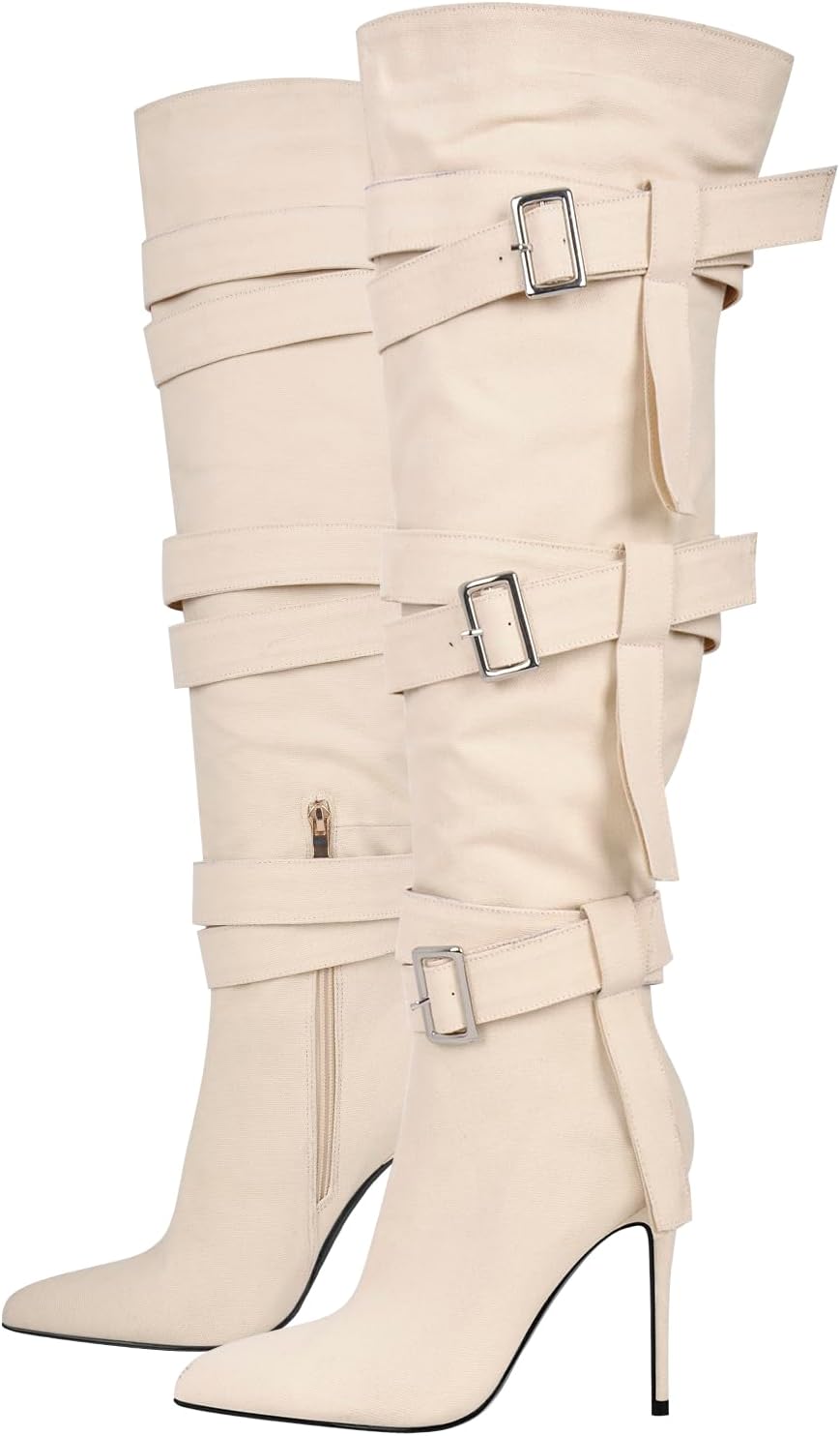 richealnini Women's Thigh High Boots with Straps Canvas Stiletto Heel Sexy Pointed Toe Party Riding Boots