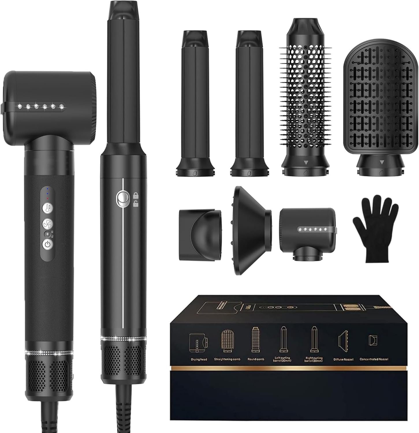 - 7-in-1 Air Curler for Hair Set: Tame Your dressing table, end countertop clutter and the outlet struggle. 7 in 1 hair dryer brush set hair station consolidates hair tools you need into a single one, Achieve hairstyle effortlessly, 2 x air curling iron wrap, 1 x hair dryer head, 1 x concentrator, 1 x hair dryer with diffuser, , 1 x straightening brush, 1 x round brush blow dryer, the air styler wrap that makes fast curl, straight, dry, volumiz, massage skin.