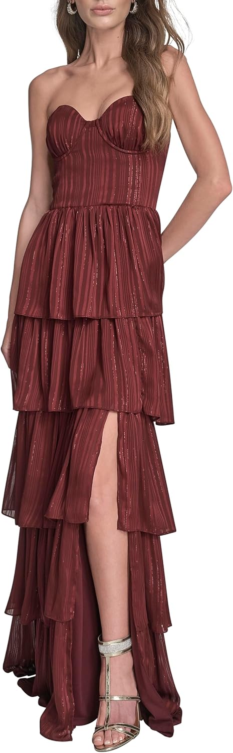 BCBG Womens Strapless Sweatheart Neck Tiered Leg Slit Maxi Dress