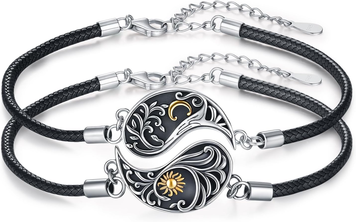 Yin Yang Bracelet 925 Sterling Silver Couple Friendship Bracelets Tree of Life/Sun Moon/Mountain/Lotus Abalone Jewelry for Women Men Couples, Leather Cord 7+2 in