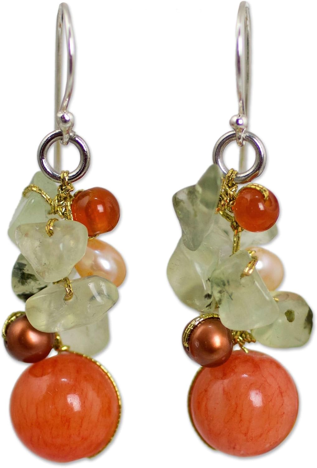 NOVICA Artisan Handmade Cultured Freshwater Pearl Carnelian Cluster Earrings Beaded .925 Sterling Silver Red Orange Dangle Thailand Celosia Birthstone 'Summer's Glow'