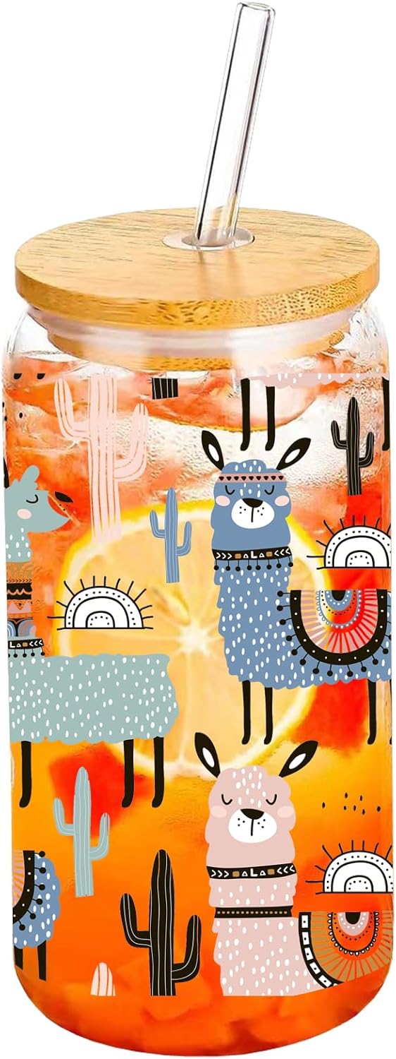 Alpaca Llama Drinking Glass Cup 16 Oz with Bamboo Lid and Straws, Iced Coffee Beer Cocktail Glass Tumbler, Holiday Christmas Birthday Gift for Dad Mom Sister Friends Bestie