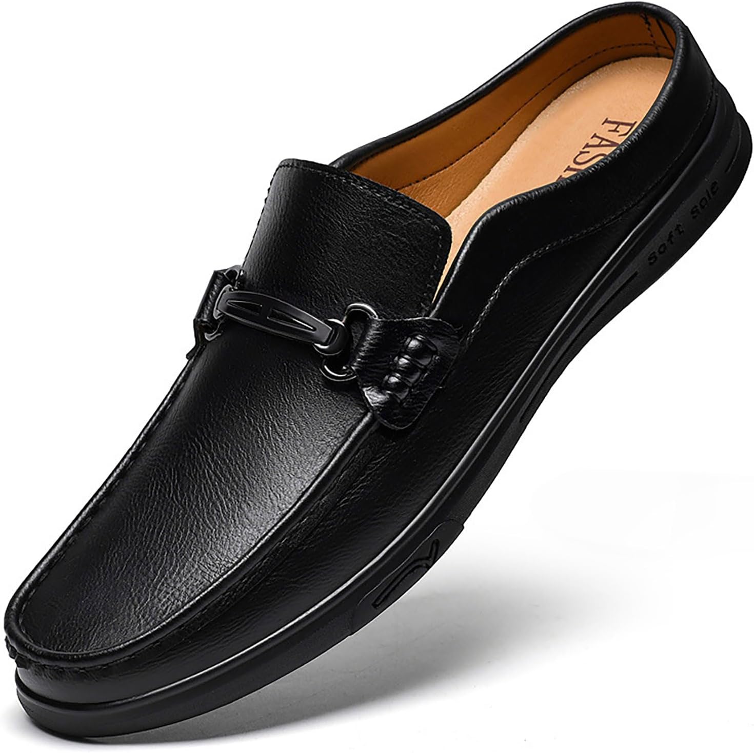 XHOGNLS Men’s Leather Slip-On Flat Clog Mules Fashion Comfort Round Toe Metal Buckle Decoration Sling Back Loafers for Business Formal Casual