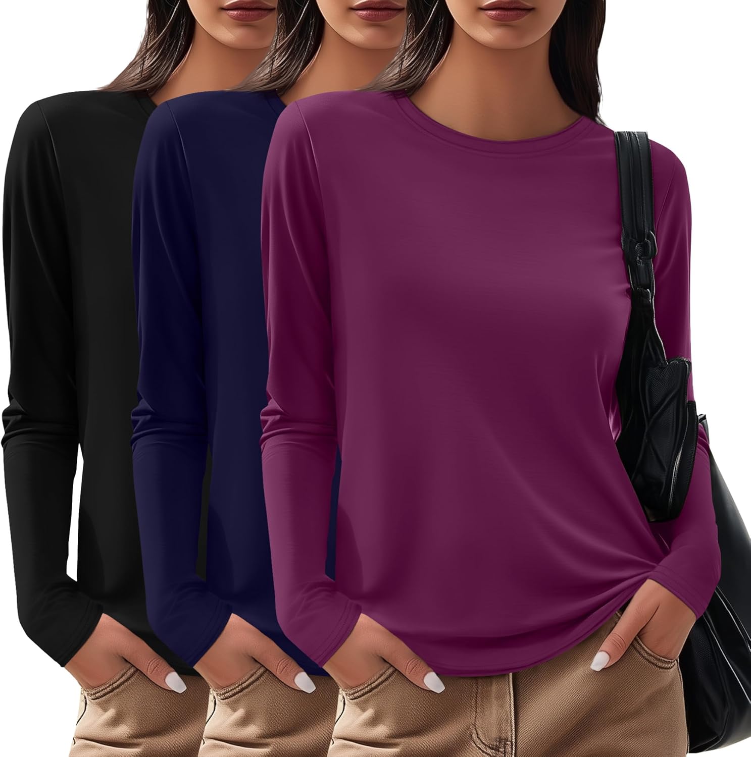 3 Pack Women's Cotton Long Sleeve Shirts, Crew Neck Casual Fitted Tops Rolled Hem Slim Layer Basic Tees Blouses(Fuchsia, Navy Blue, Black,Large)