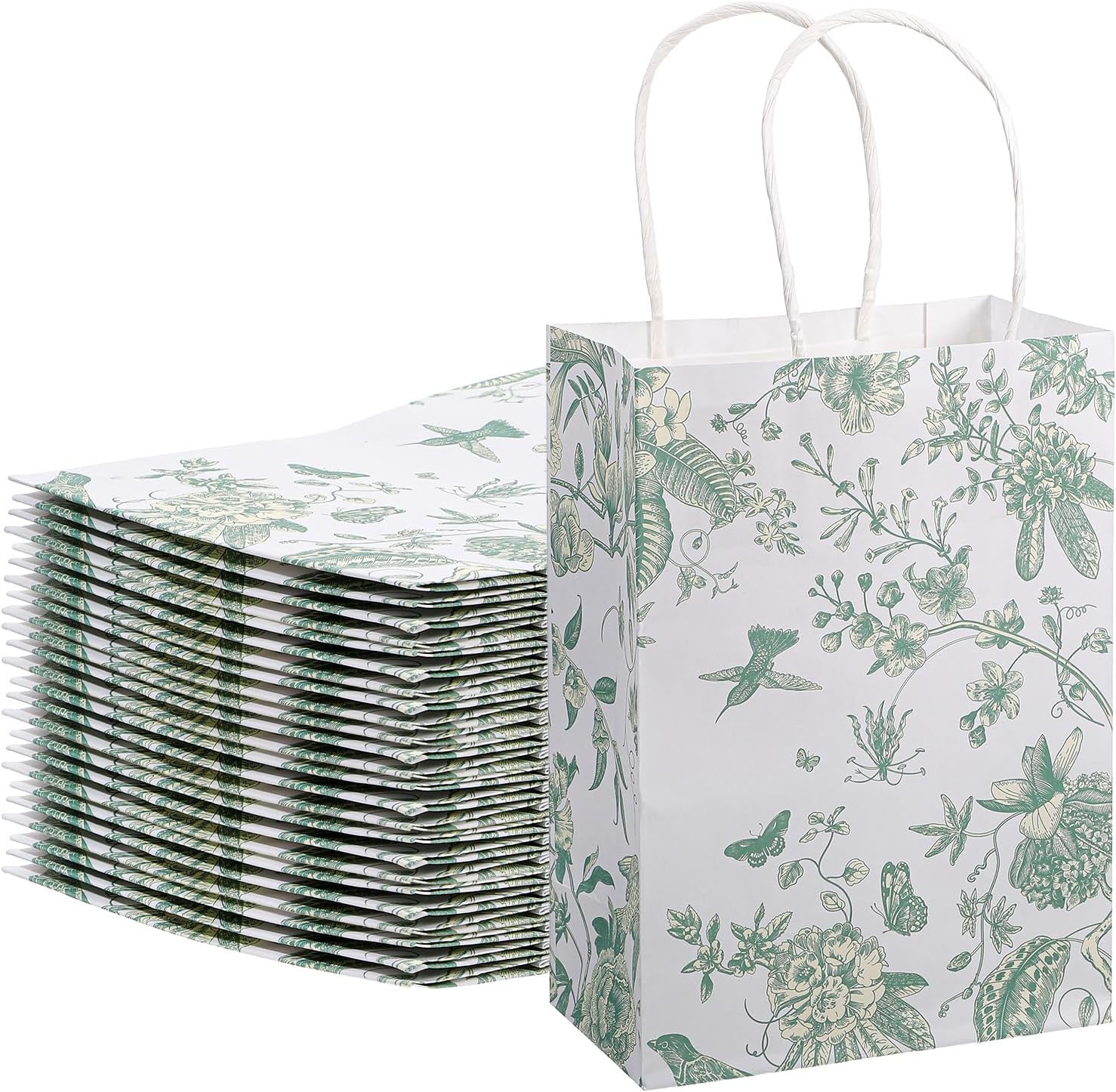 AojSup 24 Pcs Sage Green Gift Bags with Handles, Vintage Floral Gift Bags, Paper Party Favor Pouches for Wedding Birthday Baby Shower Decorations(5.9 x 3.1 x 8.3 inches)
