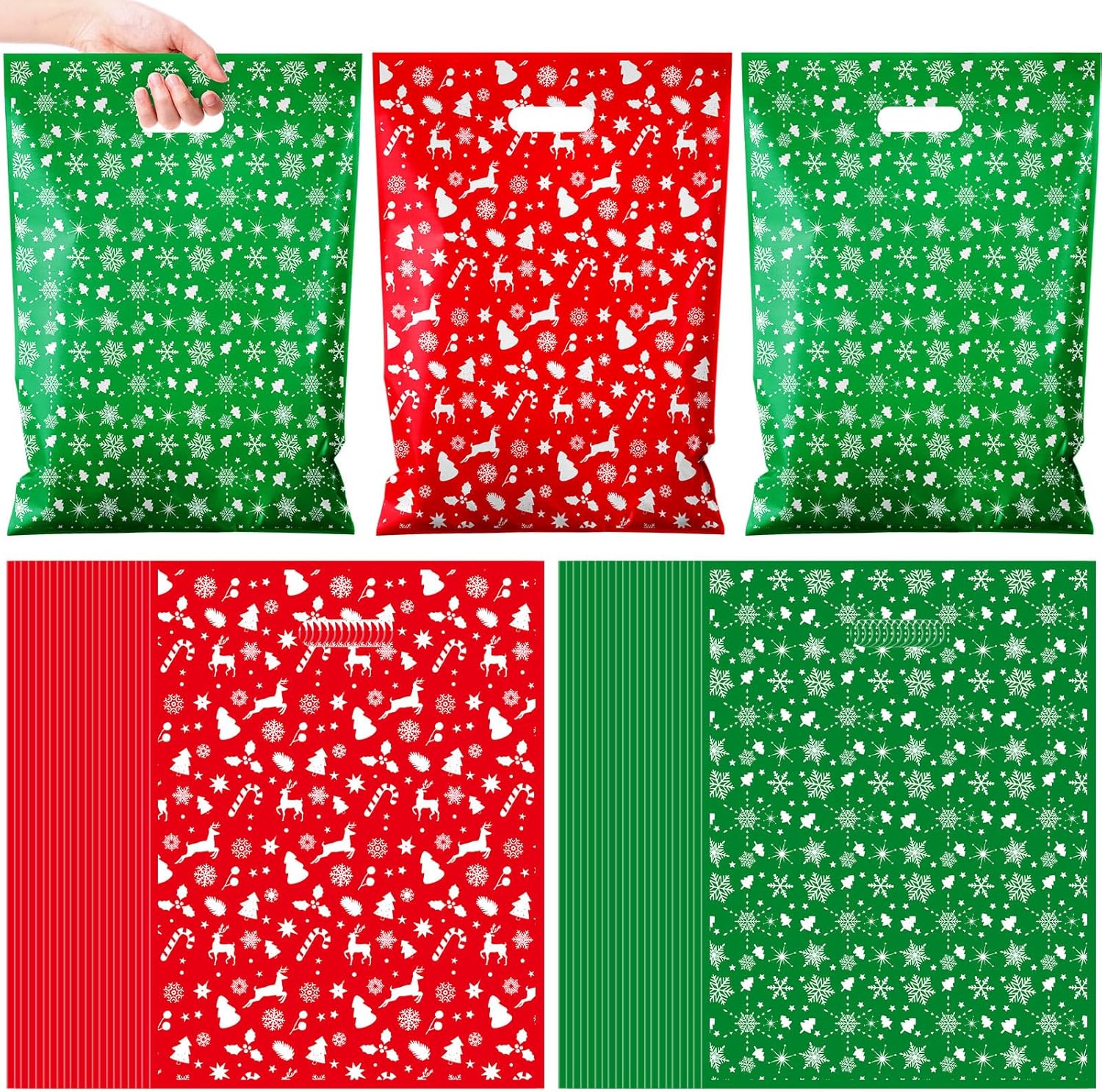 Epakh 48 Pcs Christmas Gift Bags with Handles Red Green Christmas Goodie Bags Bulk, 11" x 16" Large Xmas Plastic Reusable Snowflake Shopping Treat Bag Wrapping Bag for Xmas Party Favors