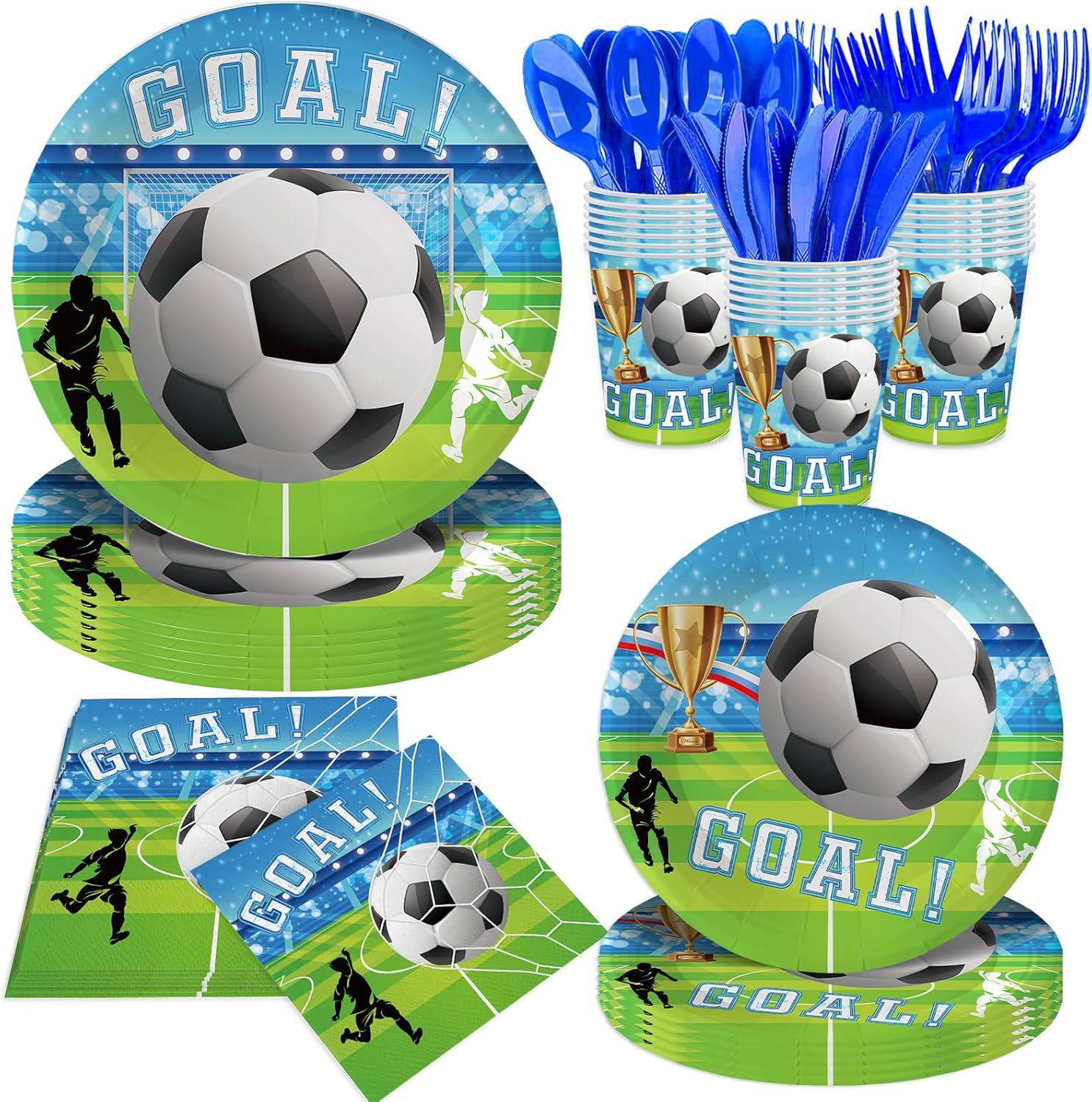 - Complete Soccer Party Tableware Set: This soccer party decorations set includes 20 9" soccer plates, 20 7" inch plates, 20 6.5" inch napkins, 20pcs cups, 20pcs Forks ,20 Knives and 20 Spoons. Serving up to 20 guests, providing everything you need for a soccer-themed celebration.