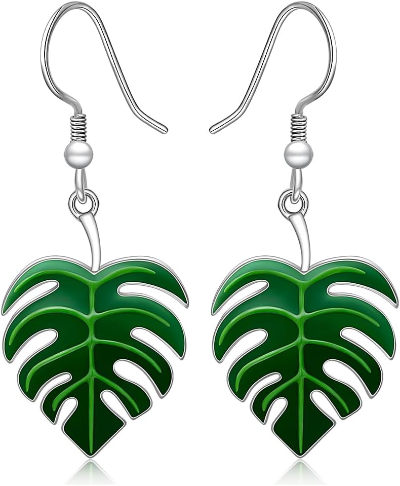 Monstera Leaf Earrings for Women Sterling Silver Dangle Green Palm Leaf Earrings Tropical Jewelry Monstera Jewelry Gifts for Plant Lover