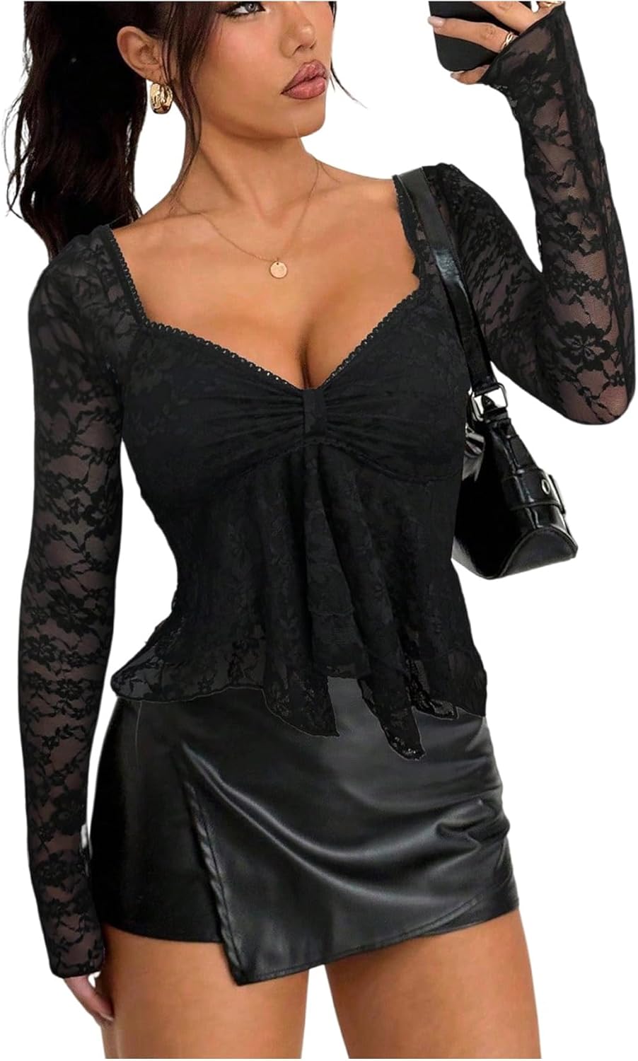 Milumia Women's Sexy Floral Lace Long Sleeve T Shirt Sweetheart Neck Flared Hem Peplum Going Out Crop Tops