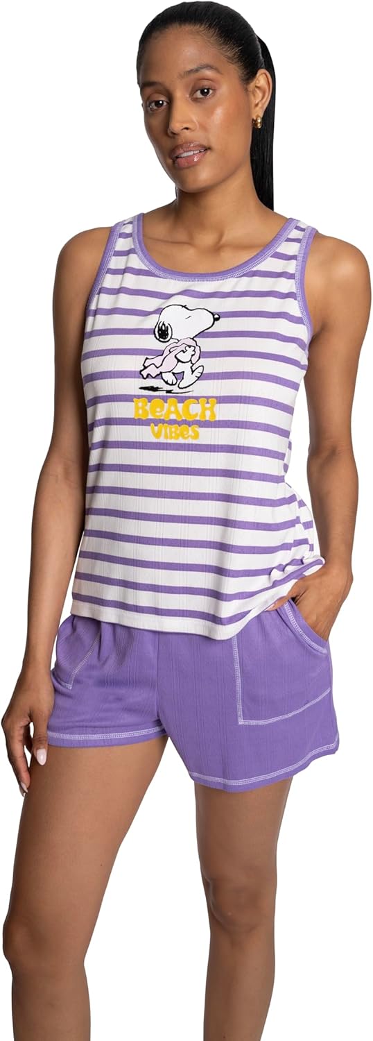 COCO BRANDS Peanuts Women's Pajama Shirt & Shorts Set with Cap Sleeve, Ruched, V-Neck Tee & Adjustable, Elastic Waistband