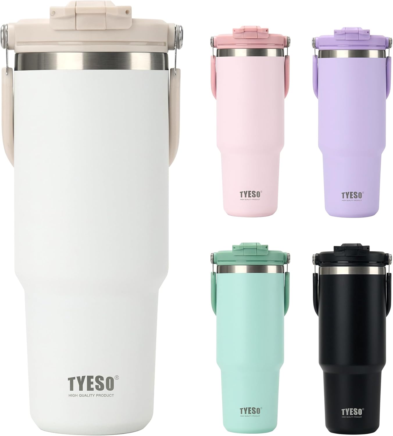 TYESO Tumbler with Flip Straw & Sip Lid, Vacuum Insulated Water Bottle, Double Wall Stainless Steel Coffee Cup Travel Mug Leak Proof (WHITE, 30 OZ)