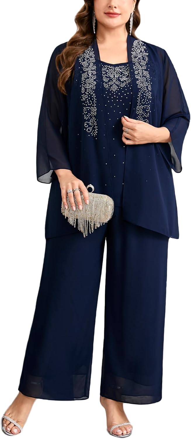 Plus Size Mother of The Bride 3 Piece Set Chiffon Pantsuit Rhinestone Embellished Formal Wedding Cocktail Outfit