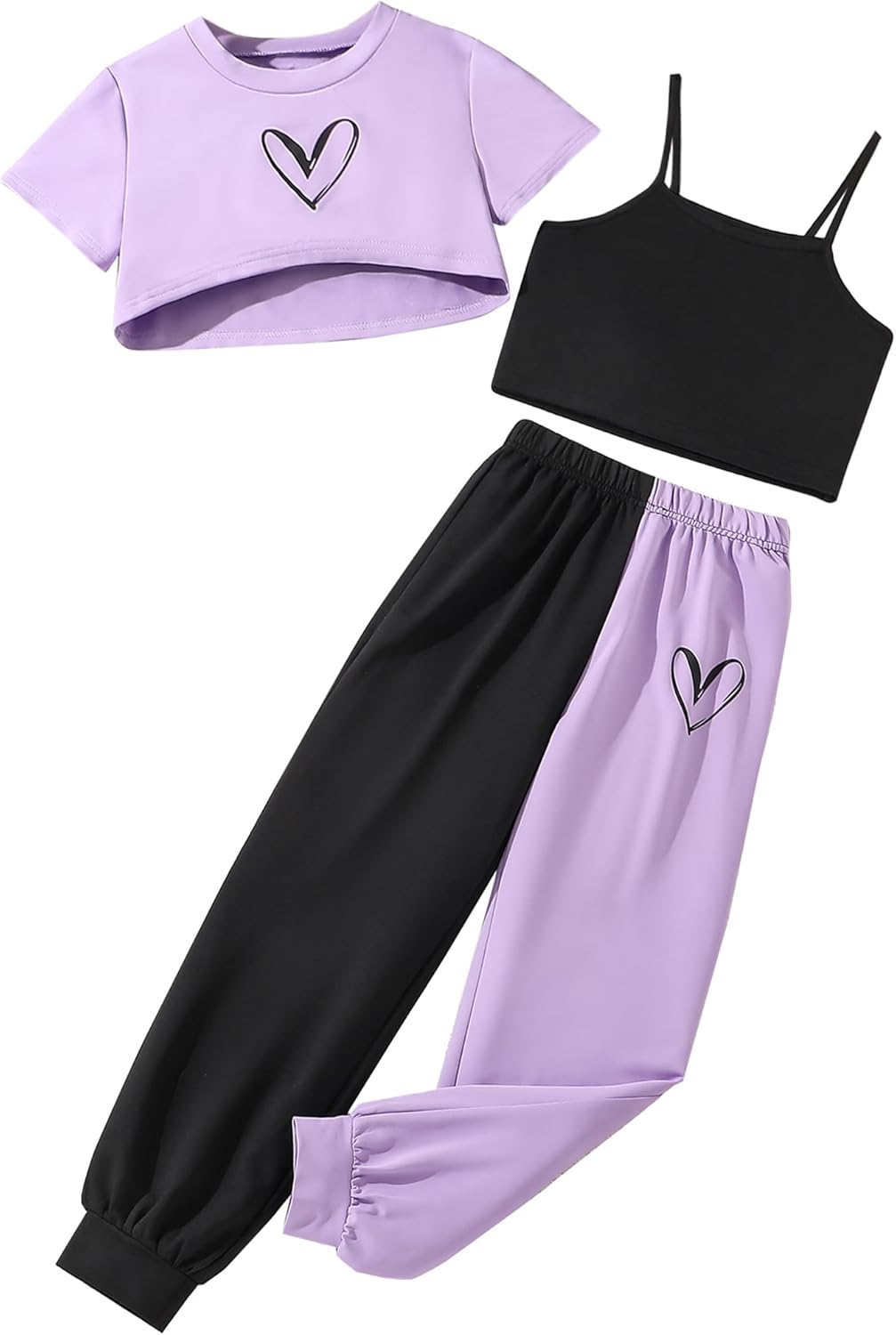 Girls' Summer 3 Pieces Outfits Graphic Crop Top and Camisole with Sweatpants Set