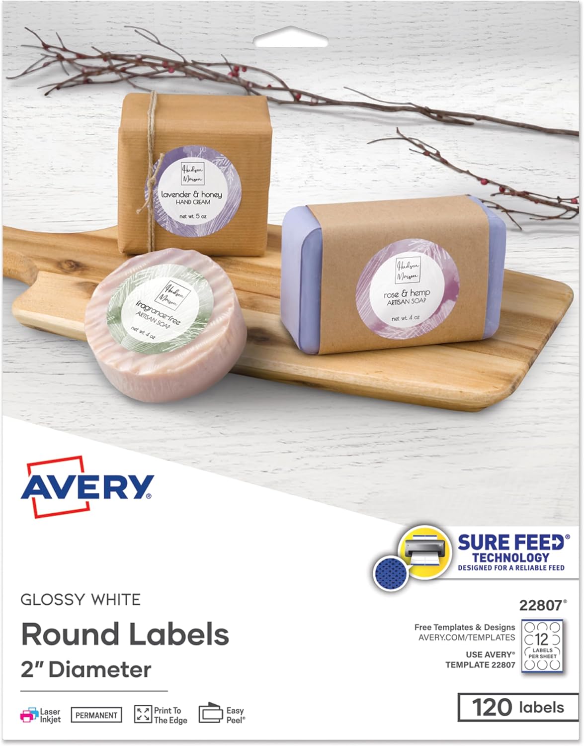 Avery Printable Round Labels, Sure Feed Technology, Glossy White Labels, 2" Diameter, Permanent Adhesive, Laser/Inkjet, 120 Total (22807)