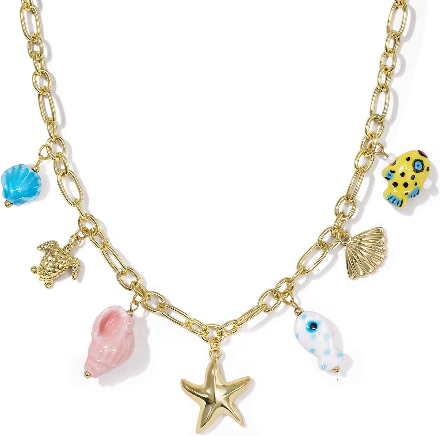 KissYan Charm Necklace for Women, 14K Gold Plated Heart Starfish Sun Pendant Fashion Link Chain Boho Summer Beach Jewelry Gifts