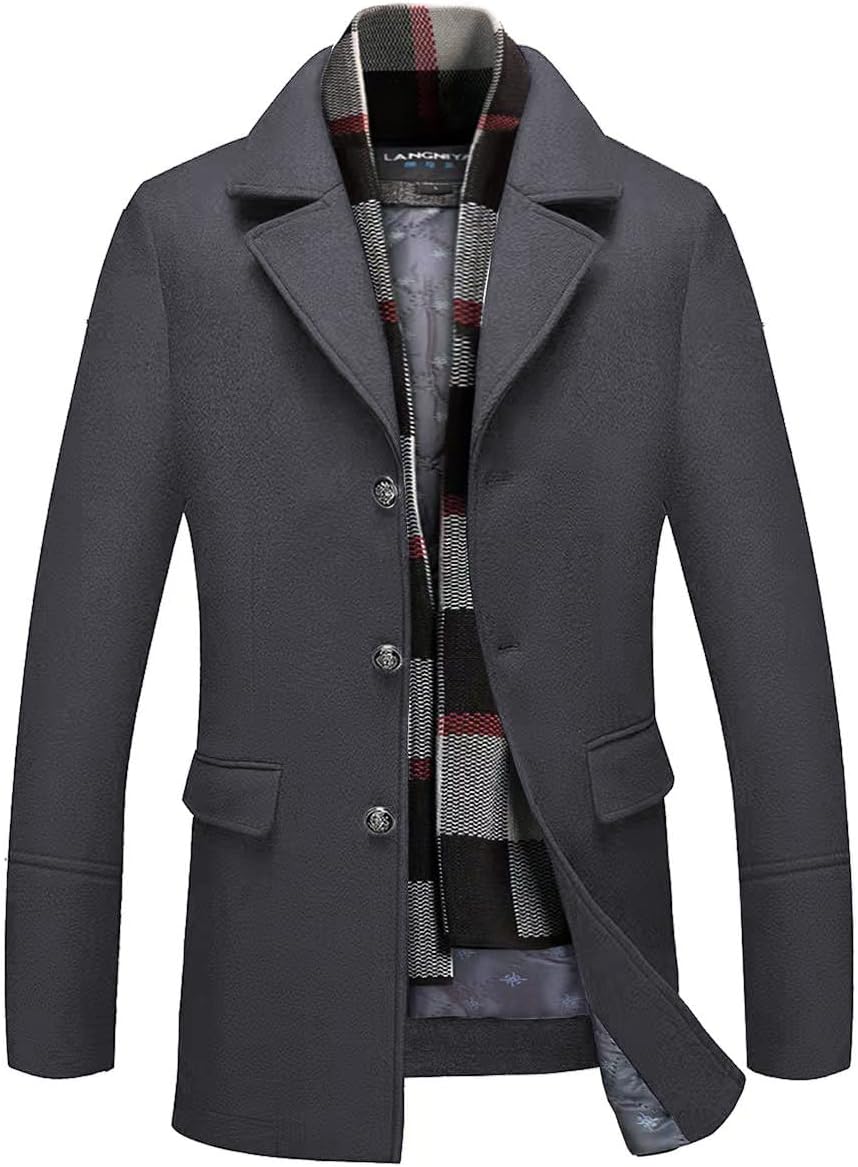 INVACHI Mens Wool Blend Coat Winter Trench Coat with Detachable Soft Scarf Single Breasted Overcoat