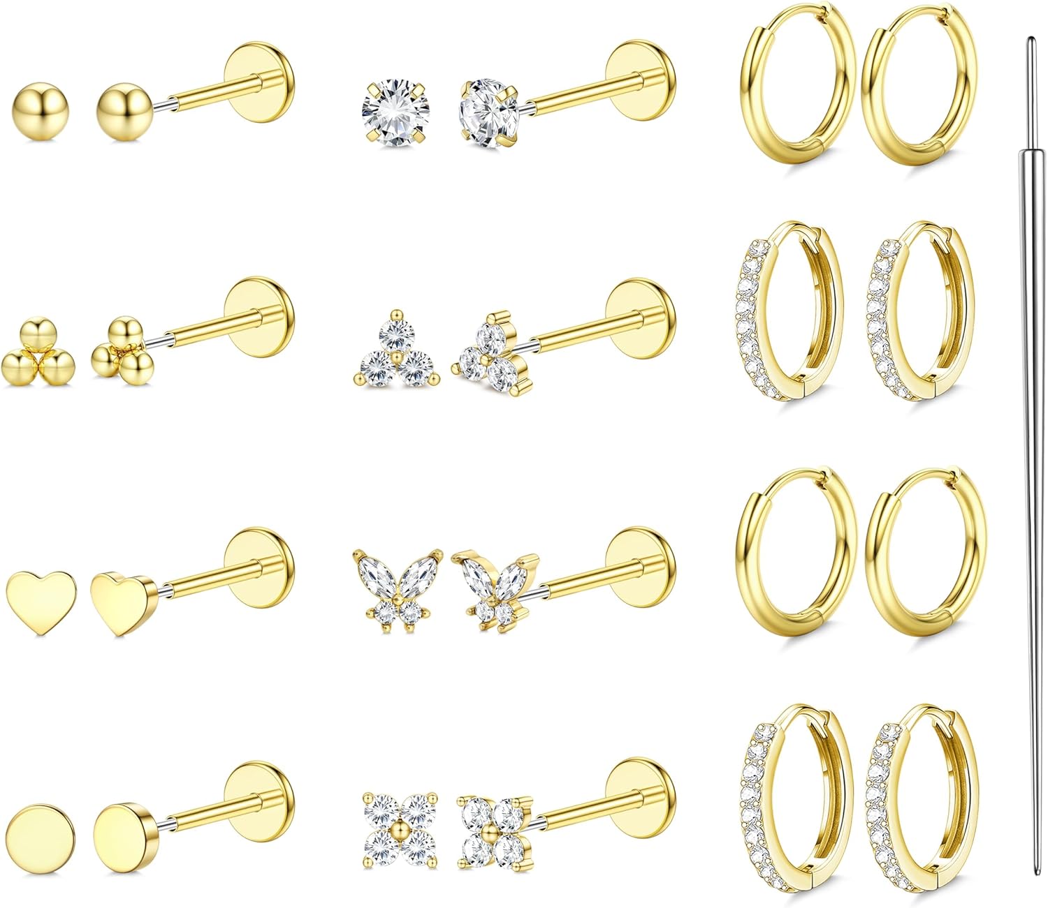 12 Pairs Threadless Flat Back Earrings Studs 20G 18G 16G Hypoallergenic Surgical Steel Push in Nose Studs Rings 14K Gold Plated Cartilage Earring Sets Helix Tragus Conch Piercing Jewelry for Women