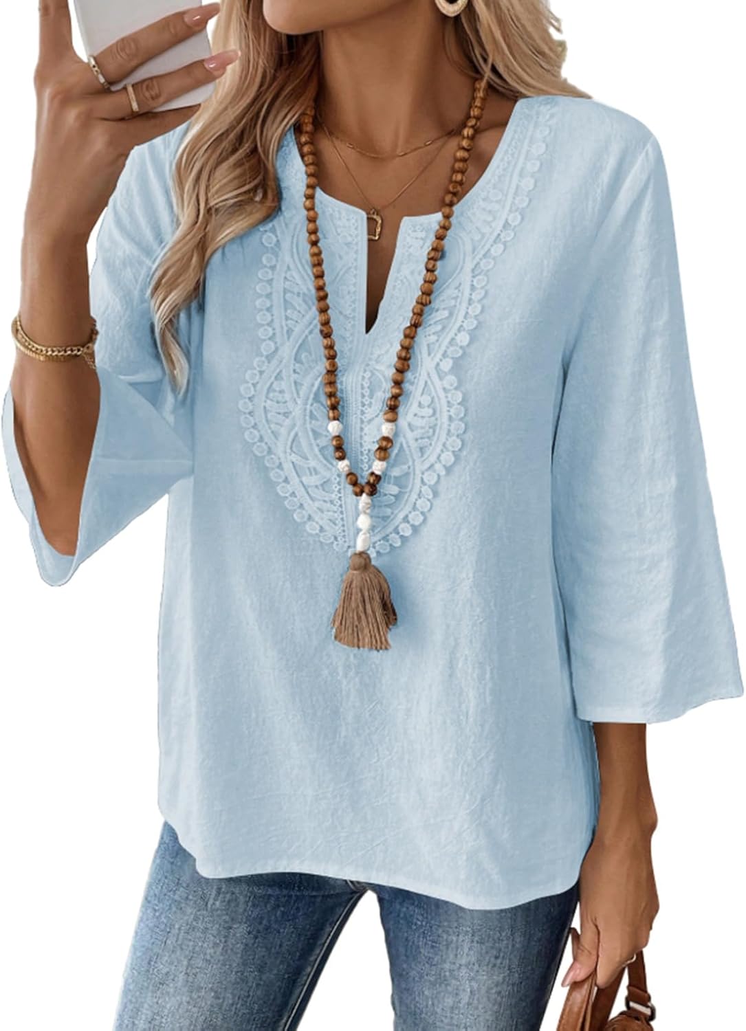 EVALESS Boho Tops for Women Blouses Dressy Casual V Neck 3/4 Sleeve Shirts Spring Outfits Trendy Vacation Clothes