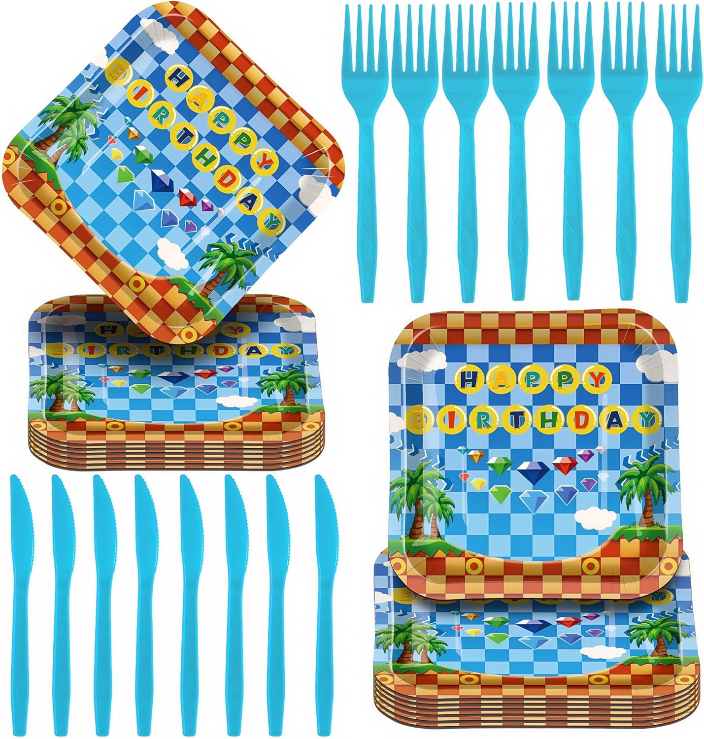 60 Pcs Hedgehog Birthday Party Supplies,Video Game Themed Decorations, Plates, Forks, Games, and Favors for Kids' Celebration