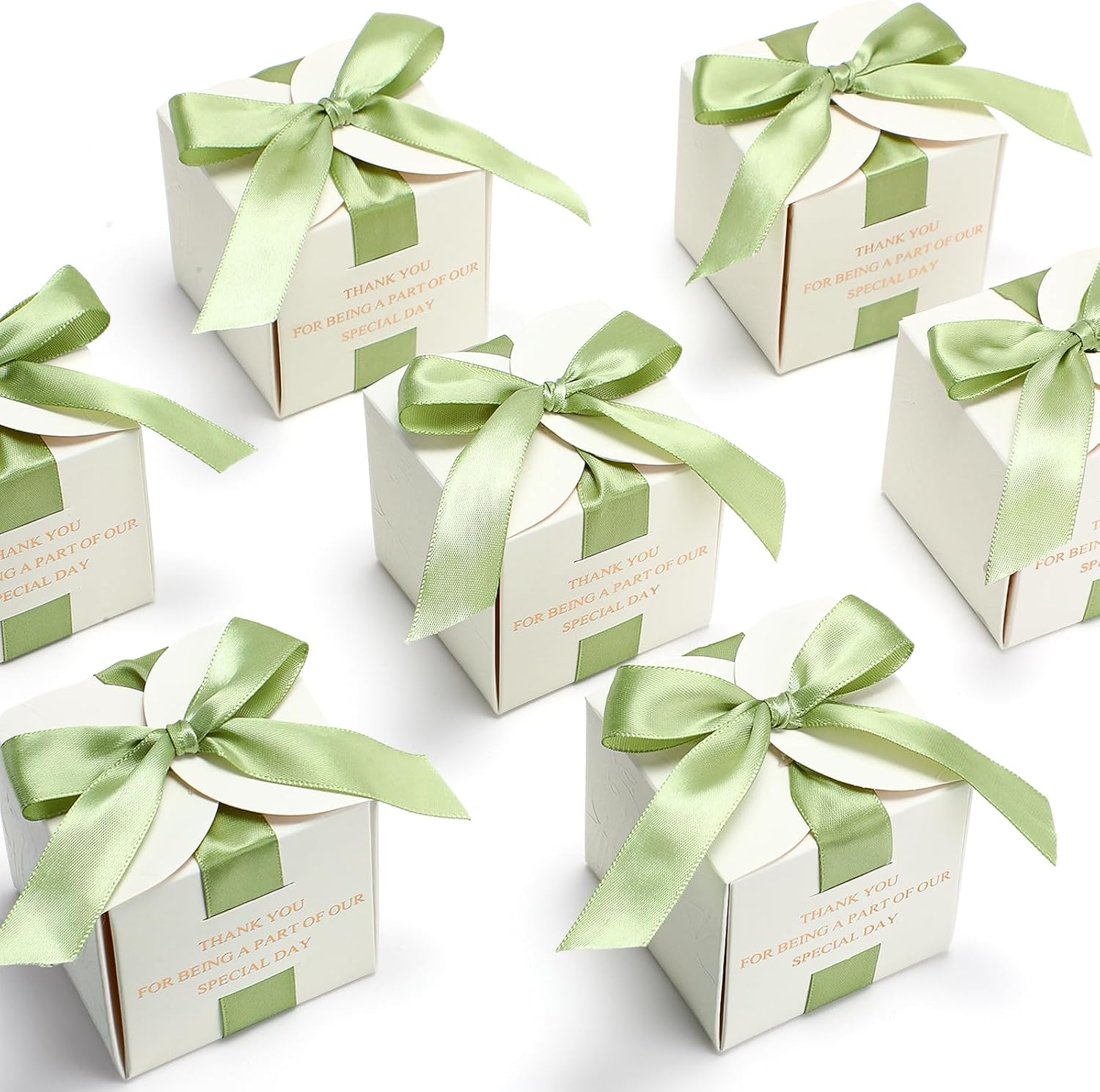 Marspark 50 Pcs Wedding Favor Boxes, 2.5 x 2.5 x 2.5 Inch Wedding Party Candy Boxes with Green Ribbons Bridal Gift for Guests Bridal Shower Birthday Party Anniversary Supplies
