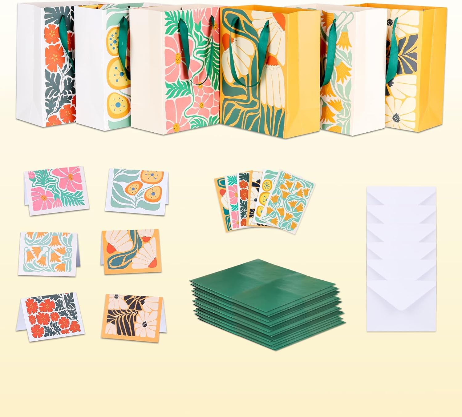- COMPLETE ALL-IN-ONE GIFTING SOLUTION: Each set includes 6 distinct medium gift bags, 18 sheets of emerald green tissue paper, 6 matching greeting cards with envelopes, and 6 decorative stickers. No need to run to the store for extra supplies; this comprehensive bulk gift bag set saves you time and provides a professionally coordinated look for every present, making gift-giving effortless and stress-free.