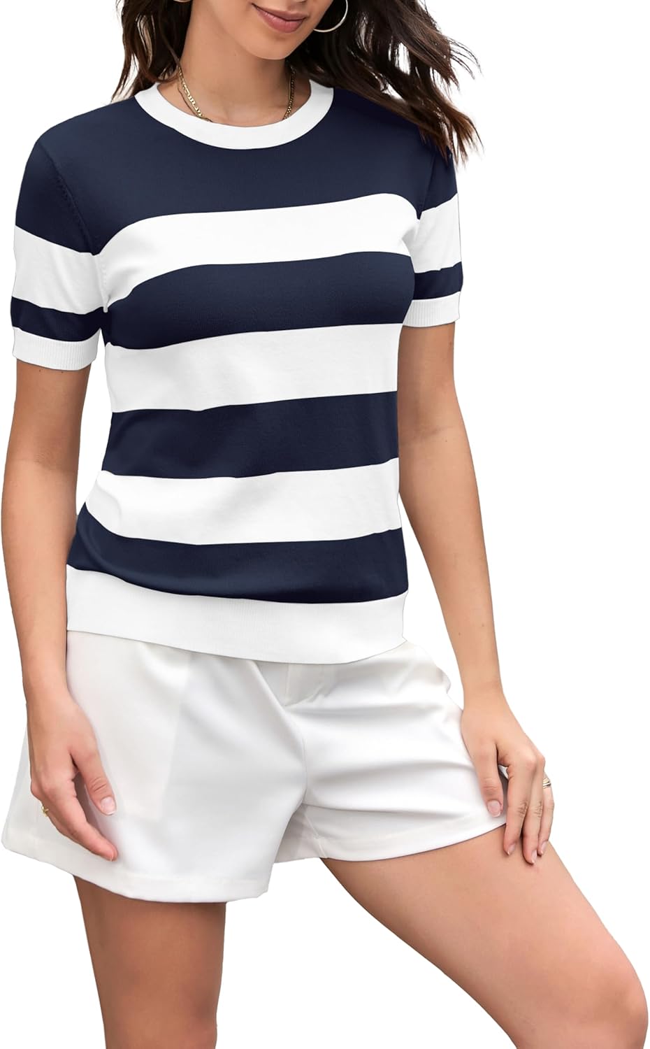DAIMIDY Women's Striped Sweater Short Sleeve Crew Neck Color Block Knit Blouse Pullover Tops