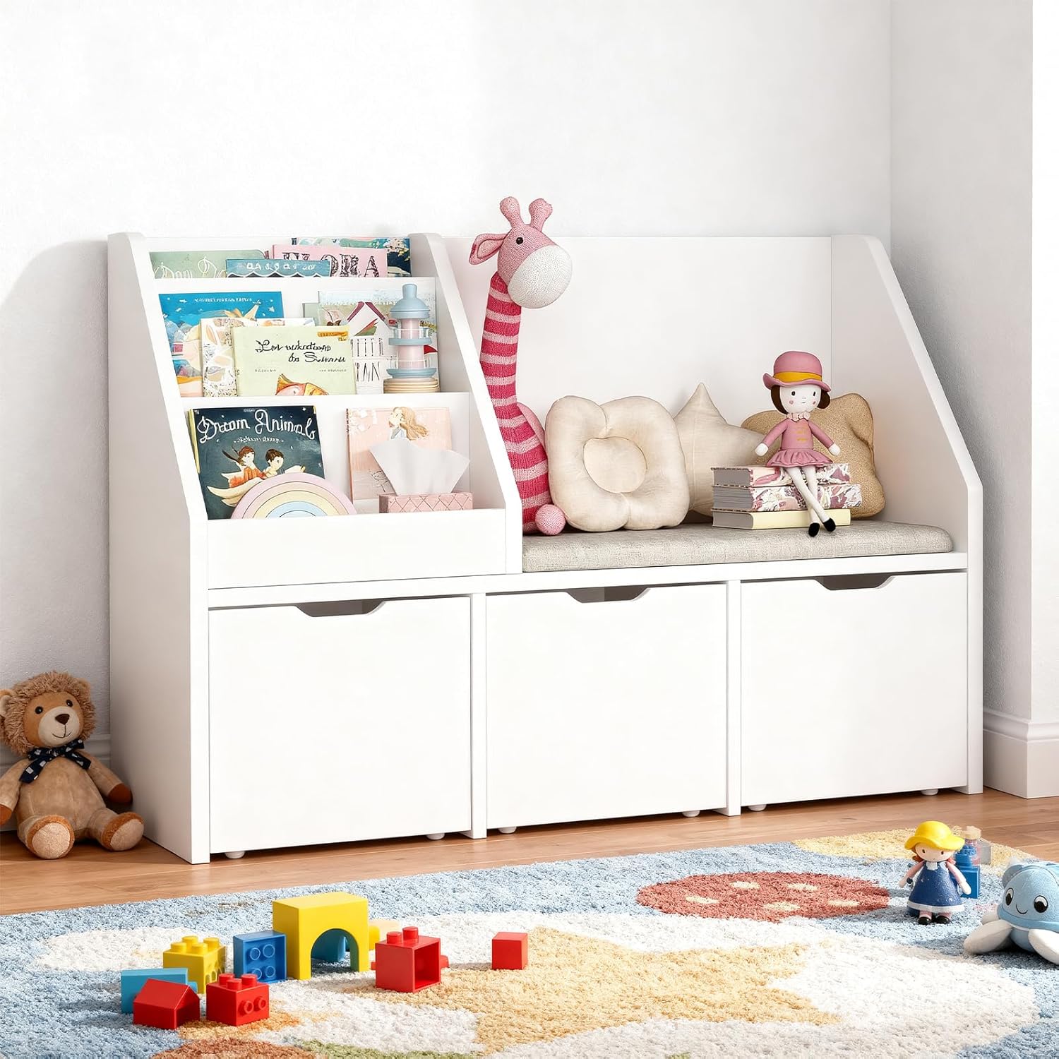 - Multi-Functional Kids Storage: A clever 3-in-1 unit that combines bookshelf, drawers, and a padded bench. Left shelves keep storybooks organized, bottom drawers hold toys and crafts, while the cushioned seat provides a cozy reading corner