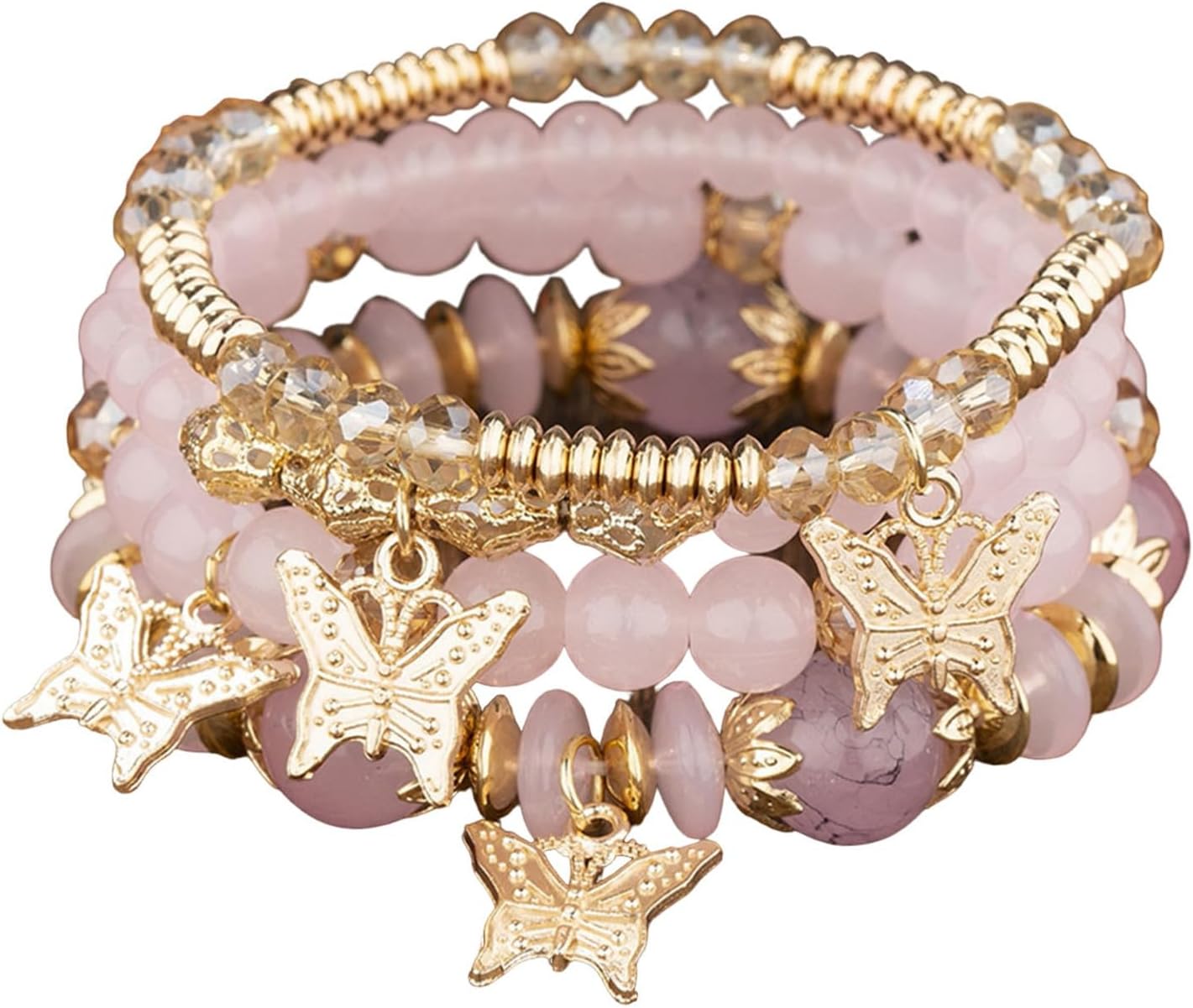 4Pcs Set Bohemian Butterfly Crystal Stone Stretch Pendant Bracelets for Women Gold Beaded Stackable Stretch Bracelet Colorful Charm Jewelry Boho Summer Beach-Pink 1
