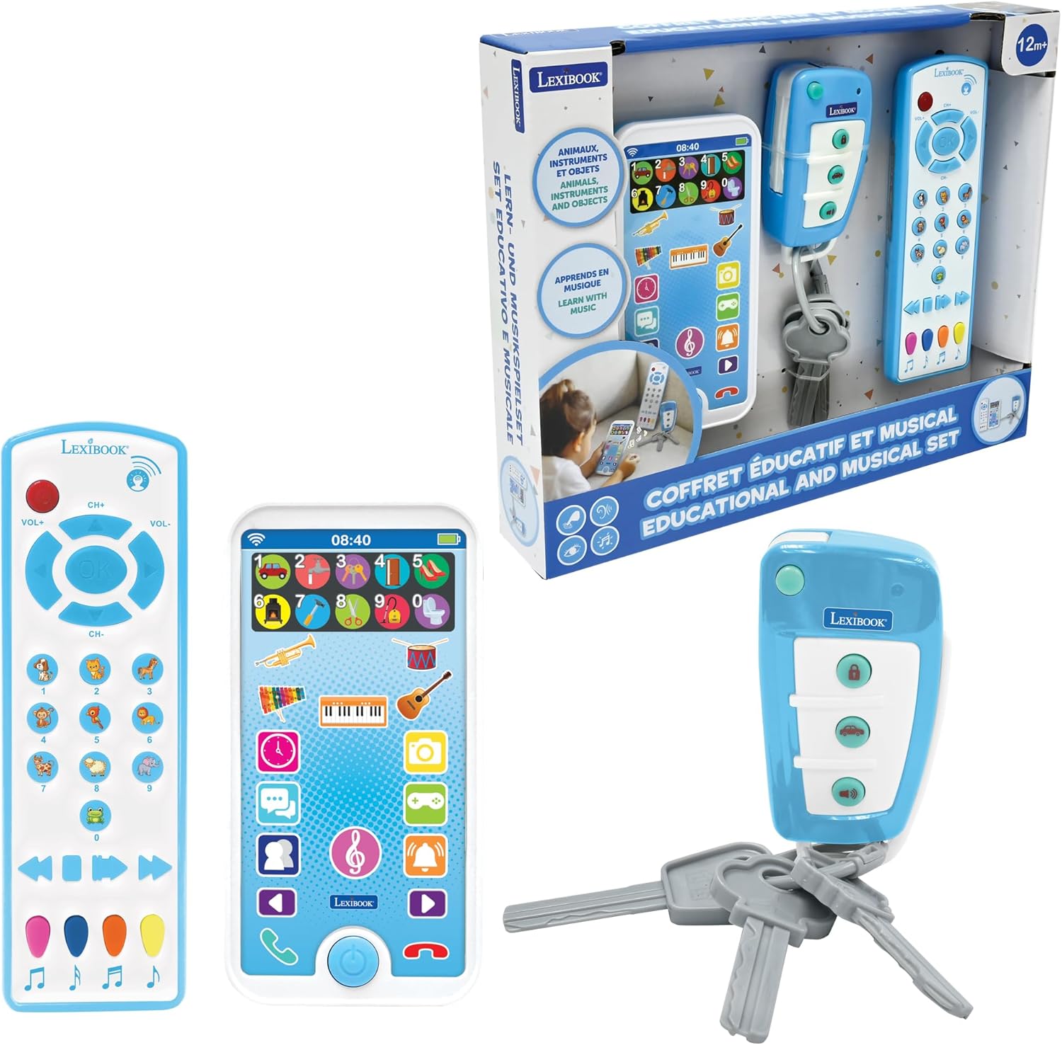 - EDUCATIONAL PHONE FOR CHILDREN - Learn through music with this phone, remote control and key ring, designed for toddlers aged 12 months and up.