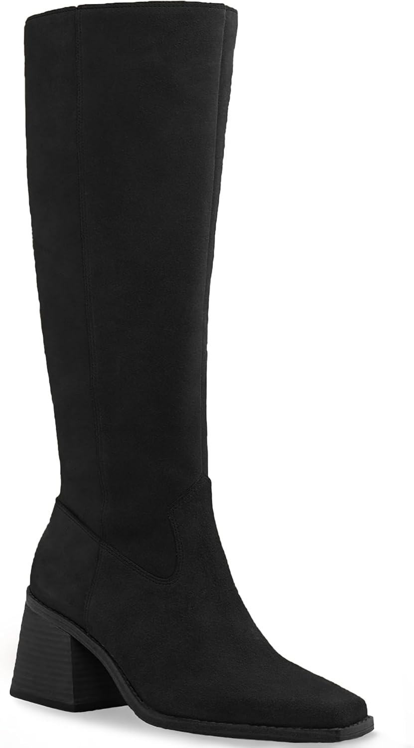 Coutgo Women's Knee High Boots Wide Calf Square Toe Chunky Heeled Pull-on Suede Boot, Black, Size 8.5