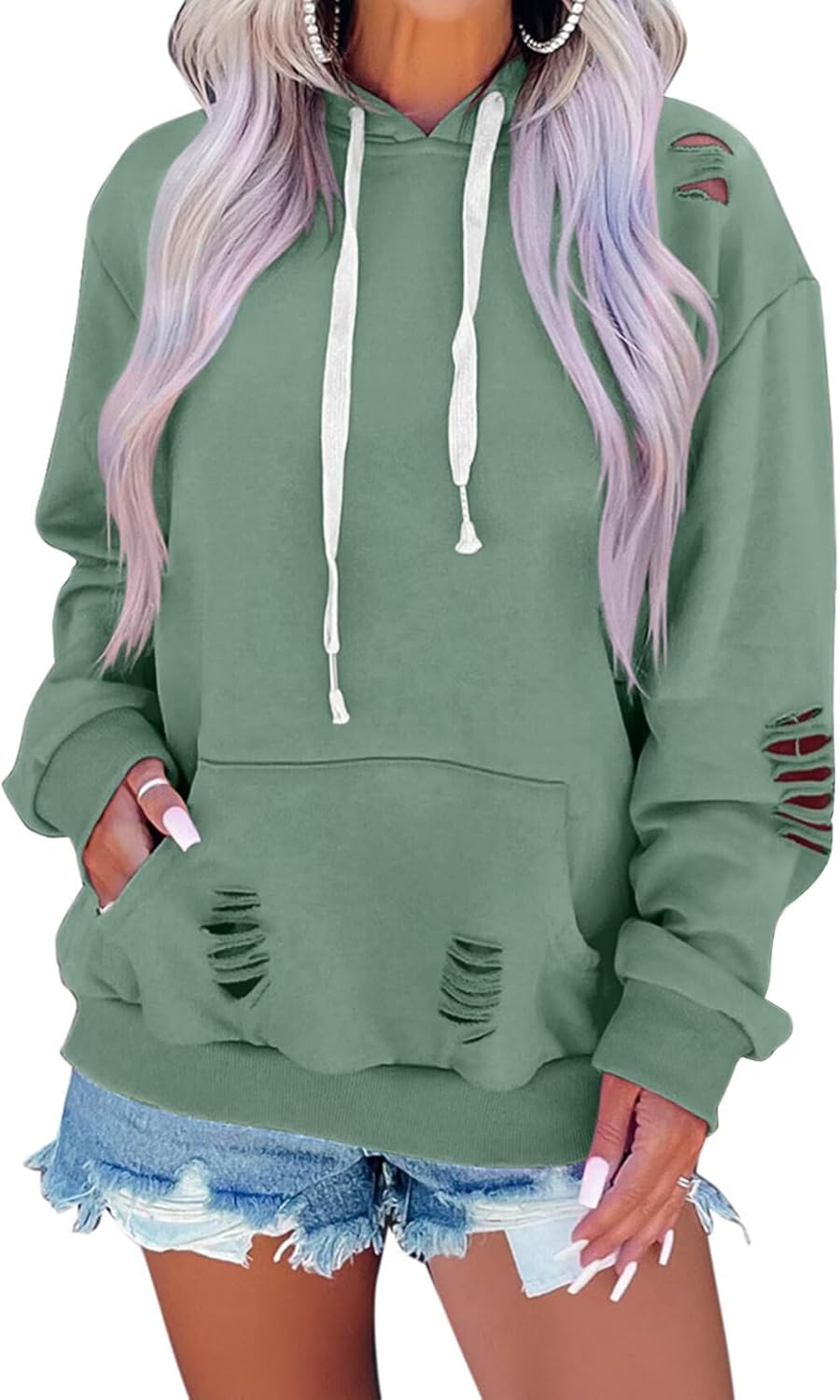 EADINVE Women's Hooded Sweatshirt Hollow Out Distressed Long Sleeve Drawstring Hoodie with Kangaroo Pocket